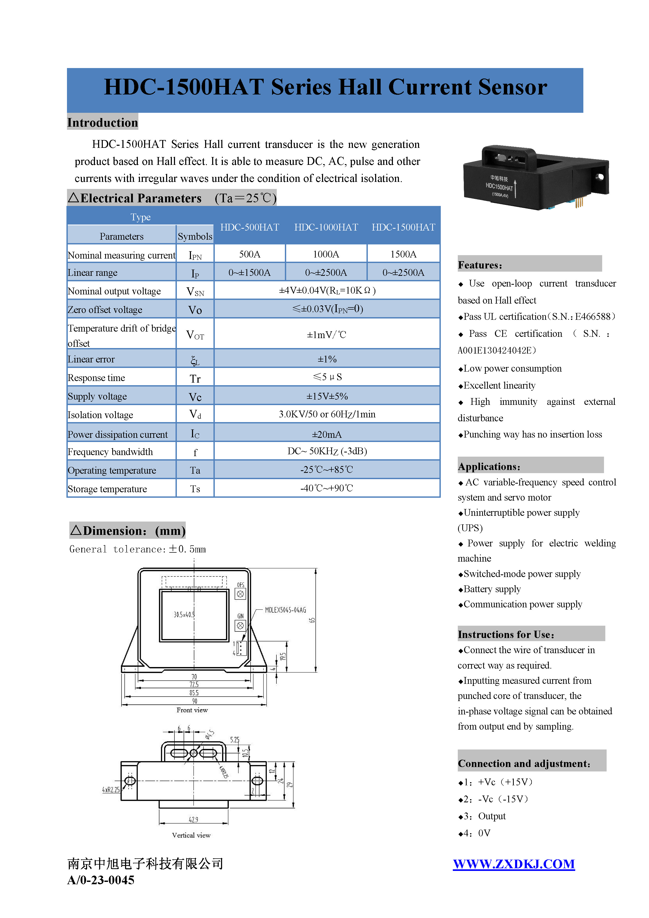 HDC-1500HAT系列霍爾電流傳感器是應用霍爾效應原理的新一代電流傳感器,能在電隔離條件下測量直流、交流、脈沖以及各種不規則波形的電流。